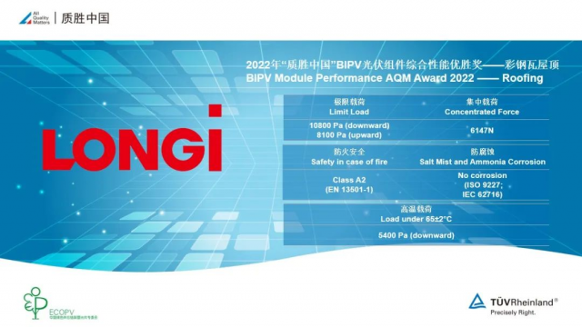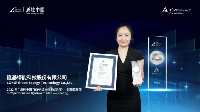 TÜV莱茵作为全球领先的光伏技术服务商,在光伏领域有着40年的丰富经验,已经连续7年举办了“质胜中国”光伏盛典活动,并在业界极具权威性。隆顶作为隆基建筑光伏一体化的标杆之作,也是目前TÜV莱茵唯一认证通过的适用于工商业屋顶的BIPV产品,该奖项亦是对隆基BIPV研发实力的认可与肯定。