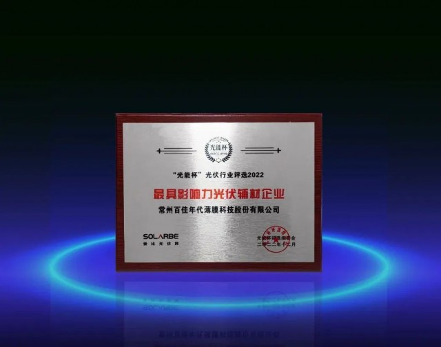 “致敬时代,拥抱变革”,2月16日,由索比光伏网主办的“光能杯”跨年分享会暨2022第十届光伏行业颁奖盛典在苏州盛大召开。百佳年代凭借其在光伏封装胶膜领域的技术研发创新、产业化成果、产品及服务品质等方面的突出贡献,再次获评“最具影响力光伏辅材企业”。