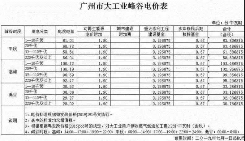 看了这些截图,你还不相信在屋顶装光伏真的可以躺着赚钱?接下来笔者再为你算一笔账:以广州1MW的光伏电站为例,单瓦造价是4.5元/瓦(注:有些地区市场价格更低),总造价就是450万元,每年分摊成本为18万(光伏电站设计寿命为25年)。1MW的光伏电站年平均发电量约110万千瓦时,广州的大工业加权平均电价为0.835元/千瓦时(具体峰平电价与时间段请看下表),上网电价为0.453元/千瓦时。