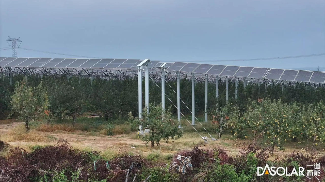 秋收时节,农光互补模式的优势尤为明显。在陕西省宜川县的黄土高原丘陵土石山区土地上,一道新能陕西华电宜川农光互补发电项目正源源不断地产生绿色电能。项目全部选用一道新能光伏组件,作为N型技术引领企业,当前公司最新一代TOPCon 4.0 Plus电池量产平均效率突破26.7%,开路电压达到742mV,多次打破大面积电池的世界纪录,超高收益率助力土地化身“聚宝盆”释放最大空间价值。此外,项目采用一道新能大跨距高架空预应力悬索柔性光伏支架系统,支架单跨33米、设计高度5.5米,巧妙架设于苹果树间,通过优化布局与反光膜铺设,确保苹果采光率超70%。