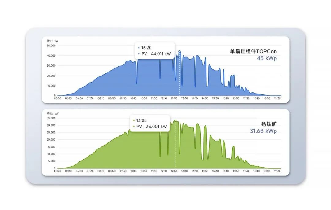 根据实际运行数据表明,尽管单晶硅TOPCon组件在弱光与温度系数上已优于单晶硅PERC,但在相同环境条件下,钙钛矿组件展现出更高的单位装机发电量和更长的等效发电时长。