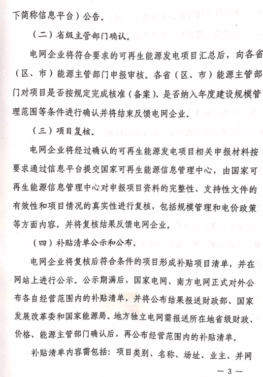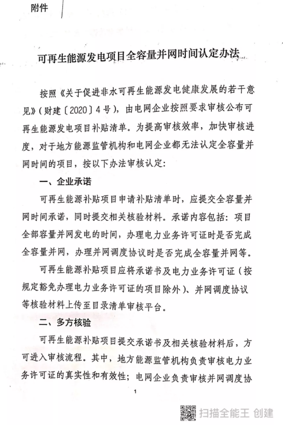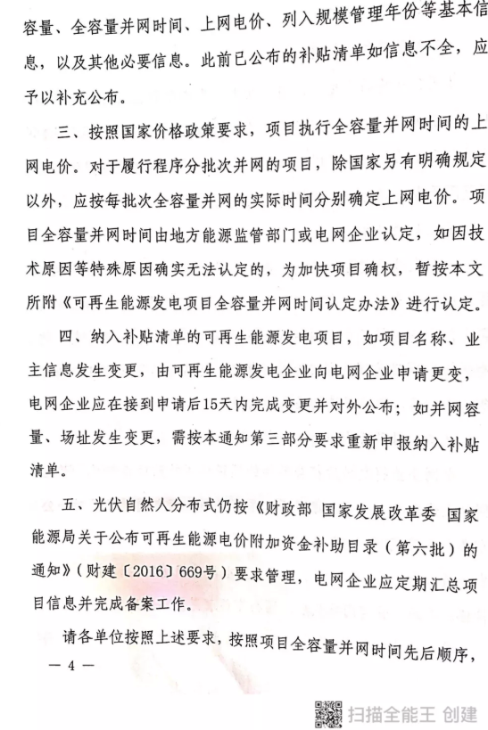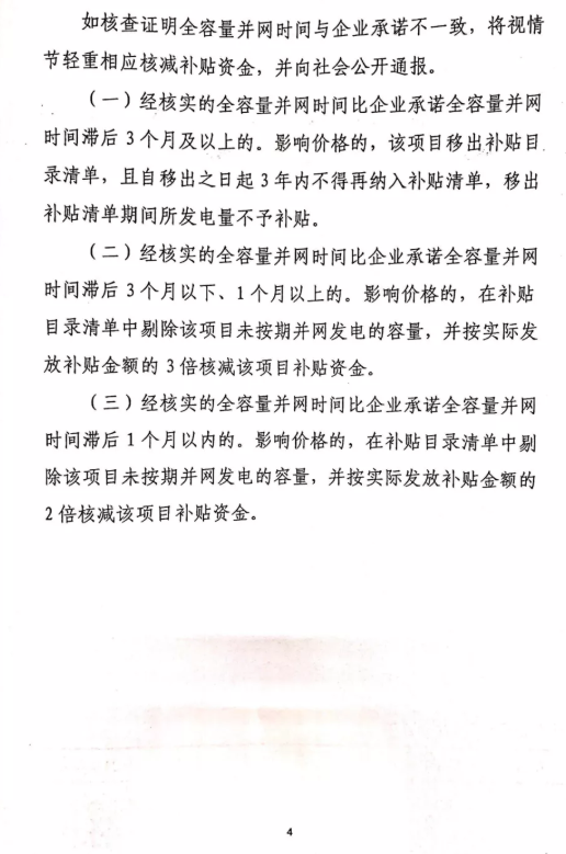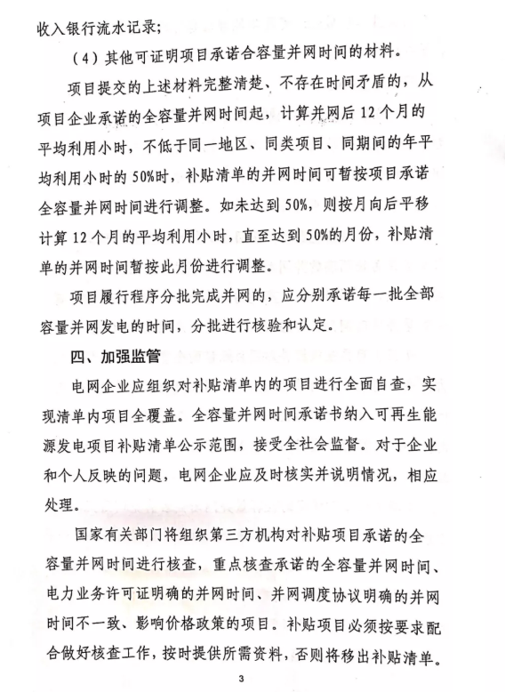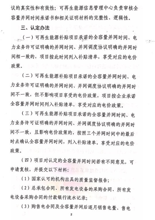 值得注意的是,70号文明确规定,所有项目必须全容量并网后才能享受国家补贴,还专门制定了《可再生能源发电项目全容量并网时间认定办法》。可再生能源补贴项目承诺的全容量并网时间、电力业务许可证明确的并网时间、并网调度协议明确的并网时间不一致,且影响电价政策的,按照三个并网时间中的最后时点确认全容量并网时间,列入补贴清单,享受对应的电价政策。