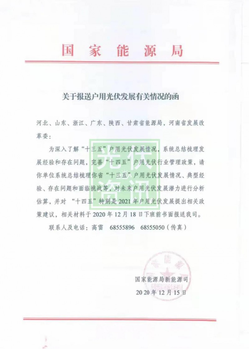预计2020年全年光伏新增装机容量约为35GW左右,没想到户用光伏撑起了全国三分之一到四分之一的装机量!户用光伏正在成为光伏发展的主力军,国家能源局也是对户用光伏相当的重视,15日专门发布文件《关于报送户用光伏发展有关情况的函》,对七个省的能源局征求意见,并要求各省对“十四五”特别是2021年户用光伏发展提出相关政策建议。