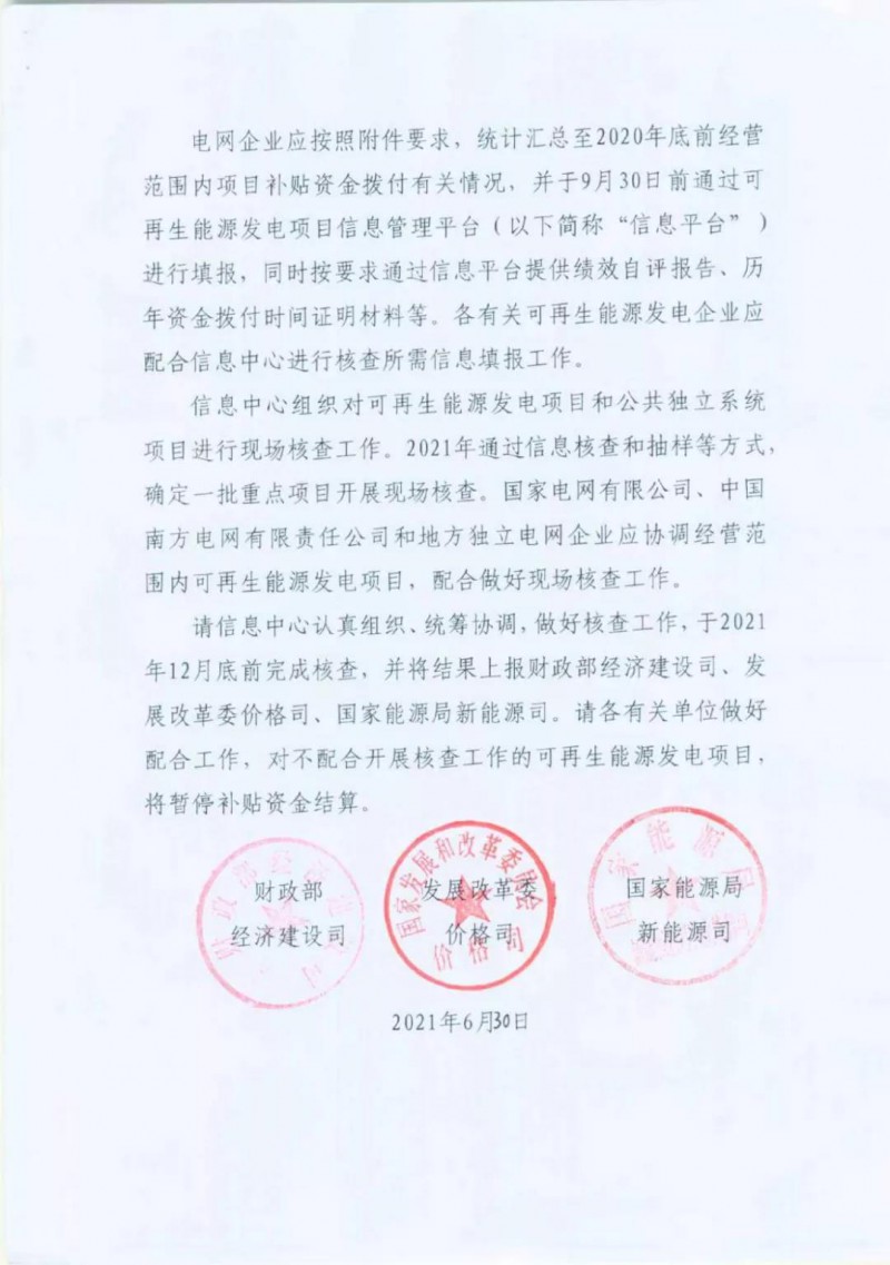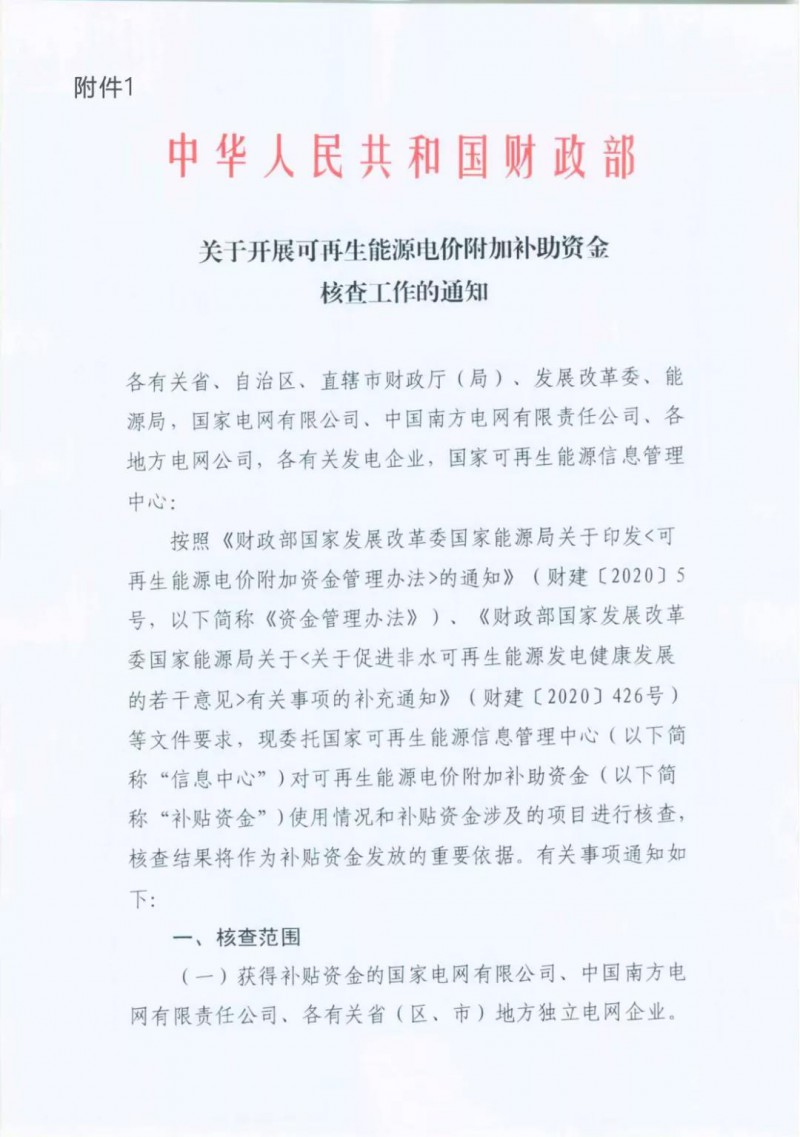 近日,财政部经济建设司、国家发改委价格司、国家能源局新能源司联合印发《关于开展可再生能源电价附加补助资金核查工作的通知》,委托国家可再生能源信息管理中心对可再生能源电价附加补助资金使用情况、涉及项目进行核查。