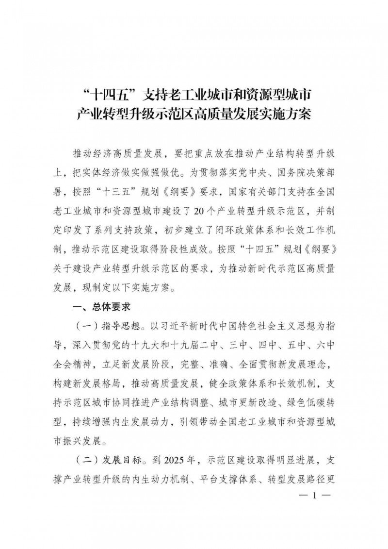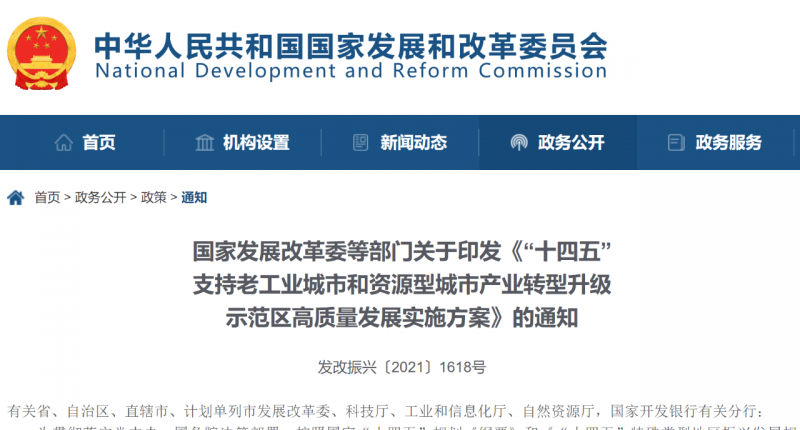 近日,国家发改委、科技部、工信部、自然资源部、国家开发银行联合印发《“十四五”支持老工业城市和资源型城市产业转型升级示范区高质量发展实施方案》。