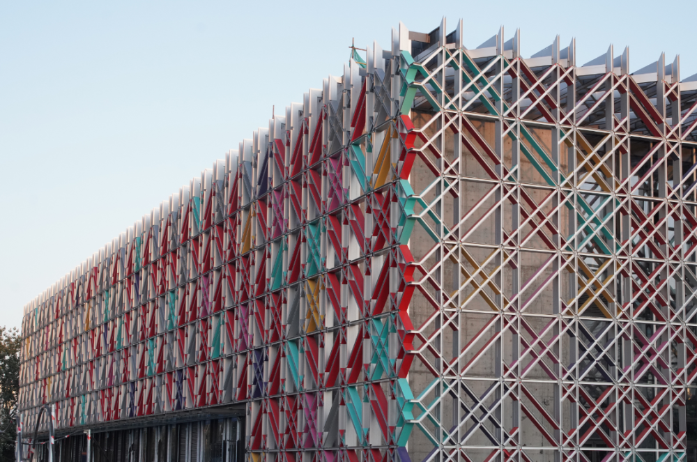 场馆的外观设计来自于雪花图案,建筑外立面均采用格栅幕墙体系,斜向格栅呈45°交叉,通过几何图形组成雪花的图案。