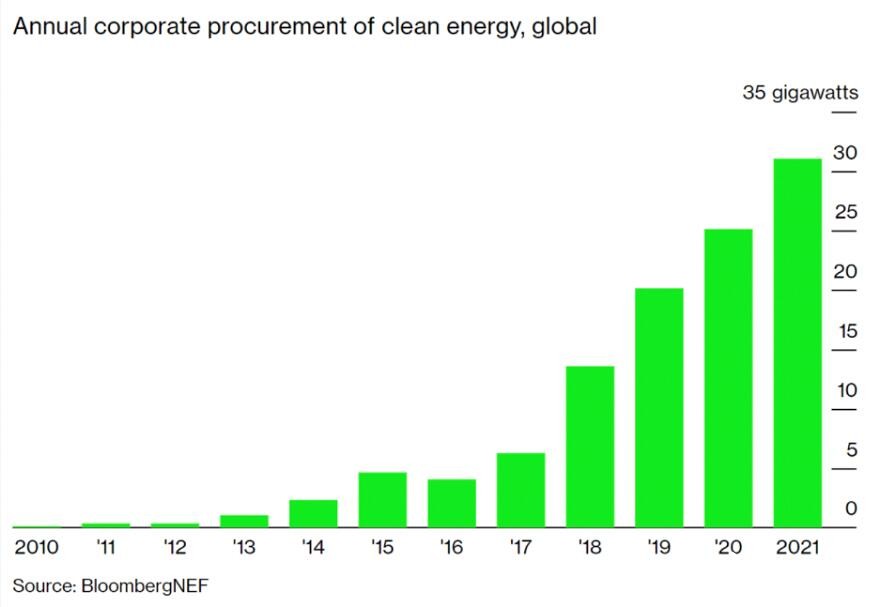 2021年有 67 家公司加入了 RE100(100%可再生能源倡议),总计有 355 家公司承诺使用 100% 可再生能源。2021年全球企业采购可再生能源合同的容量创下了 31GW 的新纪录。其中大部分产能是在美洲采购的,其中 17GW 来自美国的企业,3.3GW 来自北美和南美的其他国家的企业。