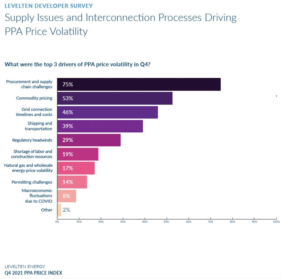 上述创纪录的太阳能光伏的采购是在光伏成本上升的情况下发生的。LevelTen Energy的一项调查表明,由于需求增加、宏观经济波动、供应链问题以及其他因素的影响,光伏成本从 2020 年初开始上涨。据LevelTen Energy 的最新报告, 2021 年第四季度购电协议( PPA) 价格指数显示光伏价格上涨了 5.7%,达到34.25 美元/兆瓦时。