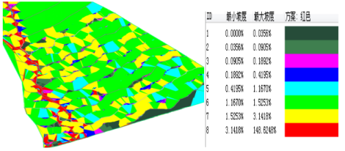 采用软件对场址局部地形坡度进行分析,按0~3°(坡度0~5.234%)、3~20°(坡度5.234~34.2%)、>20°(坡度>34.2%)对地形图进行分析,某项目分析成果如下图: