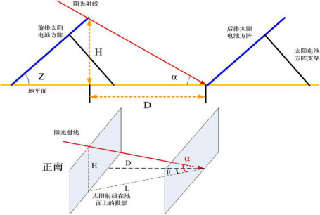 以固定式光伏阵列为例,光伏组件南北间距示意如下图所示: