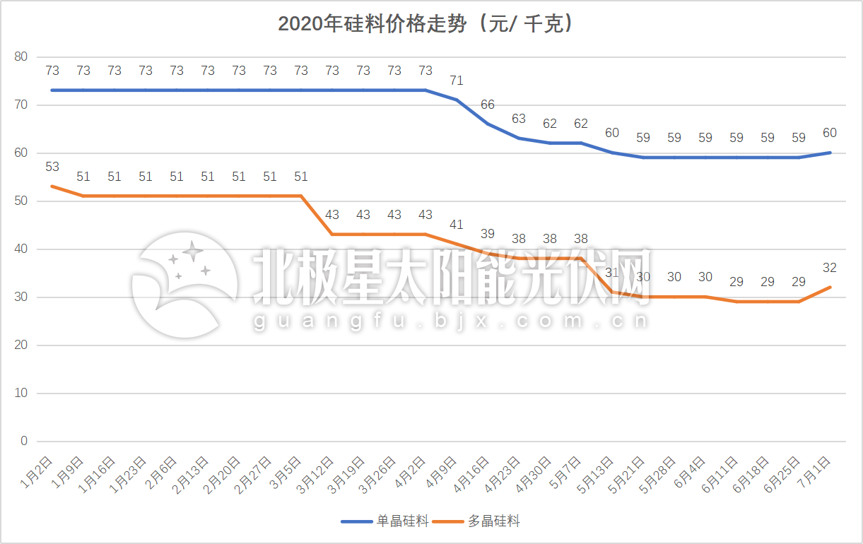 市场需求爆棚之下,光伏产业链价格应声涨价。7月1日,第三方咨询机构PVInfoLink发布最新价格,持续下跌半年之久后,硅料价格率先喊涨,其中,多晶硅料上涨3元/kg,单晶硅料上涨1元/kg。