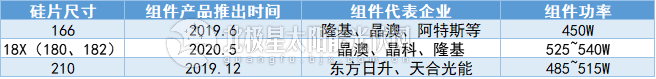 然而,“理想很丰满,现实却骨感。”由“天升环”(天合、东方日升、中环股份)主导推动的210组件,由于从硅片、电池到组件均需重新投建产线,拖累组件量产速度;颇为神秘的18X则随着晶澳、联合晶科、隆基、阿特斯、潞安太阳能、江苏润阳、江苏中宇6家企业共推行业标准尺寸落下神秘面纱,由组件最优功率倒推硅片最优尺寸为182mm,但182组件实际产量还需待明年逐季爬坡。