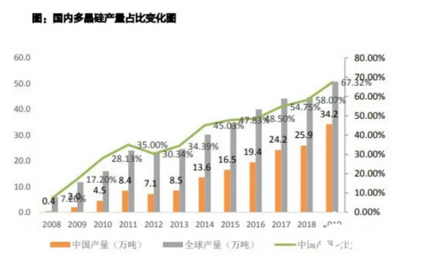2008年前,国际上硅料生产七大企业分别为Hemlock、瓦克、REC、MEMC、德山、三菱、住友,均为海外企业。随后国内企业开始了 国产替代之路。2020年,继韩国第二大多晶硅厂商Hankook破产后,韩国最大多晶硅生产商OCI也于年初宣布关闭其韩国本土产能。与 此同时,国内多晶硅产量增长迅速,中国产量由08年的0.4万吨提升至19年产量的34.2万吨,占比由08年的7.2%已提升至19年的67%。
