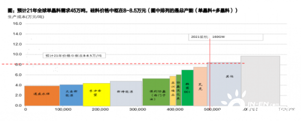 考虑单W硅耗约2.8w,则21年160GW装机需求对应约45万吨单晶料需求,根据行业成本曲线,国内五大厂,OCI,瓦克贡献43.4万吨产量, 因此21年硅料价格中枢落在较瓦克成本附近,瓦克生产成本约7.5万元/吨,考虑增值税,我们预计21年硅料价格中枢在8-8.5万元。