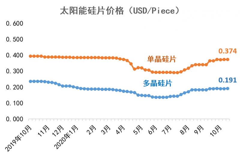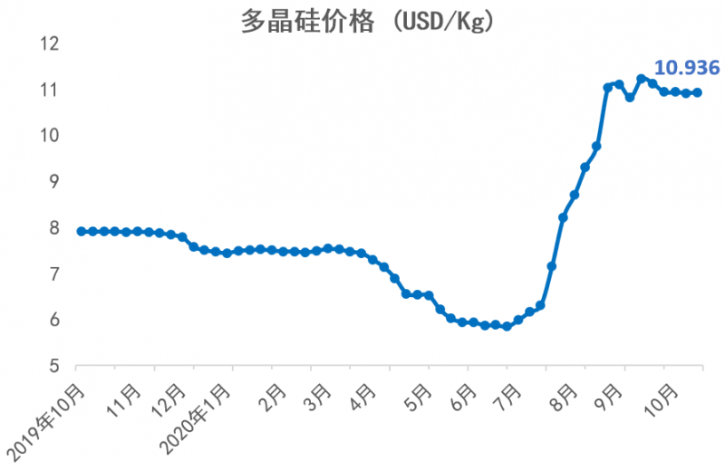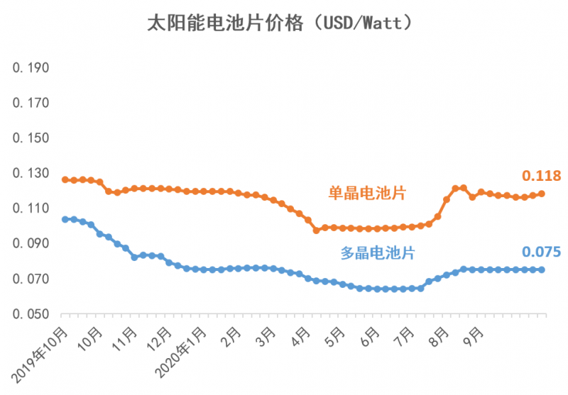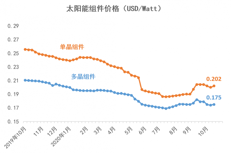 2020年10月份,由于十一期间国内大部分多晶硅片企业关停放假,对于多晶硅的采购无明显上涨需求,多晶硅现货价格从10月初开始较9月下旬的价格高点有所回落,出现小幅下滑;硅片端和电池片端的现货价格较9月份变化不大;10月玻璃价格大涨并未显著影响到组件端价格的明显波动,但会影响到部分组件厂商的开工情况。
