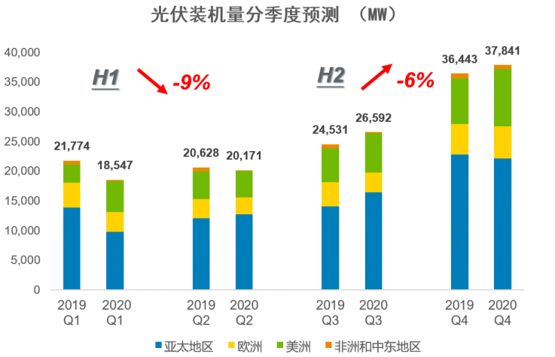 受新冠疫情影响,2020年上半年光伏装机总量较去年同期减少了9%;下半年预计装机量将同比降低6%,同比降幅比上半年减少3个百分点。得益于疫情后的恢复情况良好,2020年下半年装机量较上半年将有显著恢复。