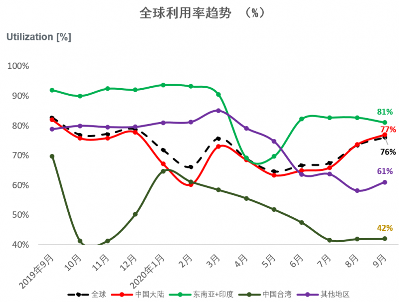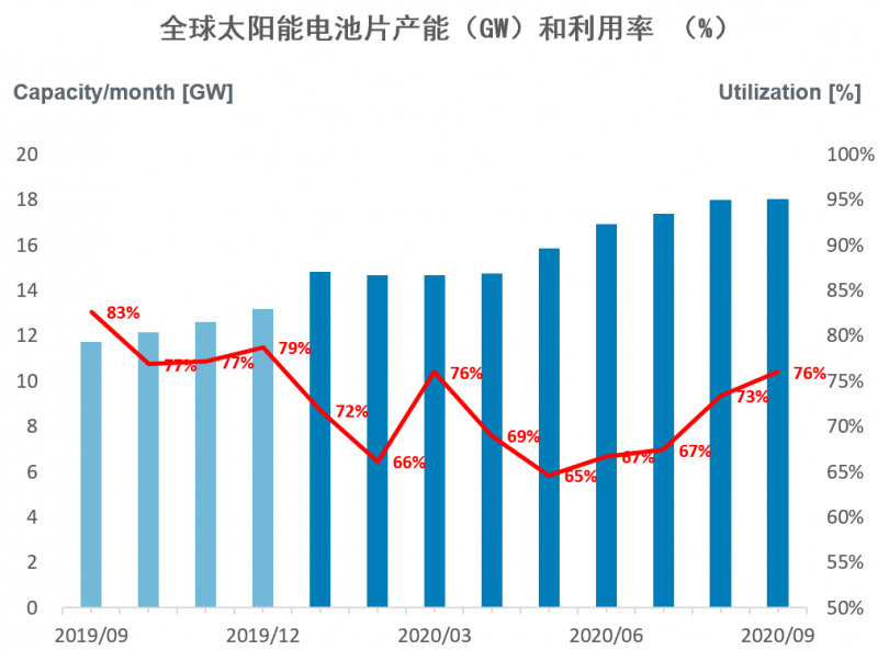 2020年9月份,得益于终端装机容量从新冠疫情影响中的迅速恢复,全球电池片产能利用率持续增加至76%;中国大陆地区电池片产能利用率也增速恢复至77%,而中国台湾地区的电池片产能利用率仍然保持在40%左右的低位。