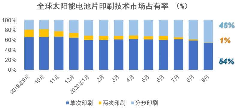 截至2020年9月份,两次印刷技术的全球市场份额已缩减至1%以下,后续将逐步被市场所淘汰。单晶PERC比多晶更多使用分步印刷技术,目前已有大约48%的单晶PERC都采用了分步印刷技术。即便如此,仍有51%的单晶PERC使用单次印刷技术,单次印刷技术位居市场主流。