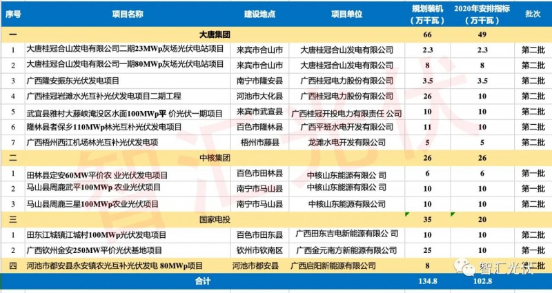 2020年11月,广西能源局发布《关于印发2020年平价风电和第一批平价光伏项目建设方案》的通知,公布了广西2020年平价风电和第一批平价光伏项目建设方案,其中: