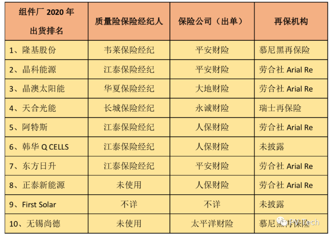 根据第三方调研,截至2021年6月底,全球排名前10的组件大厂使用的保险公司及经纪公司相关情况主要如下(不含组件厂为个别市场买的个别产品):
