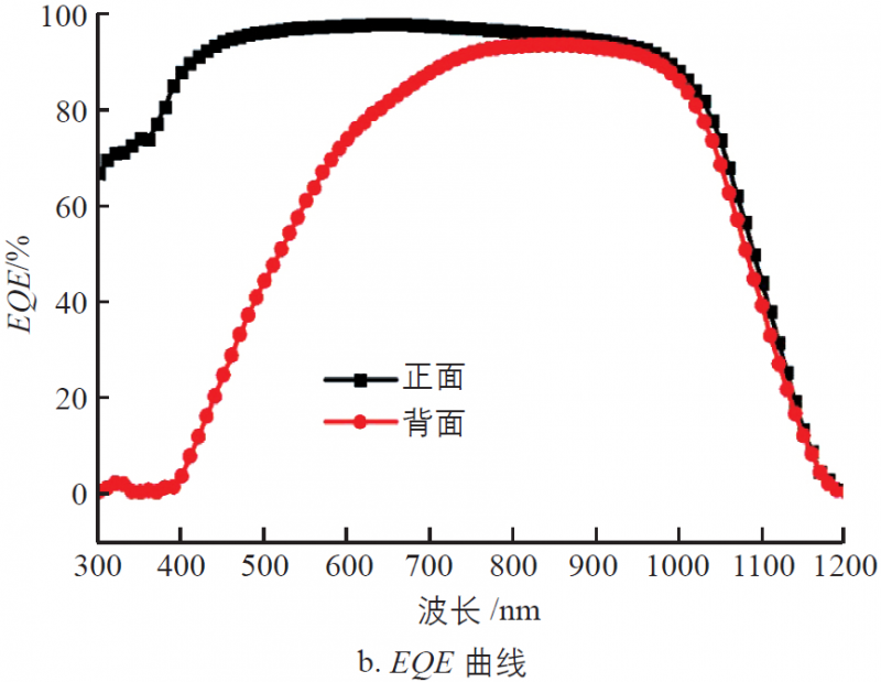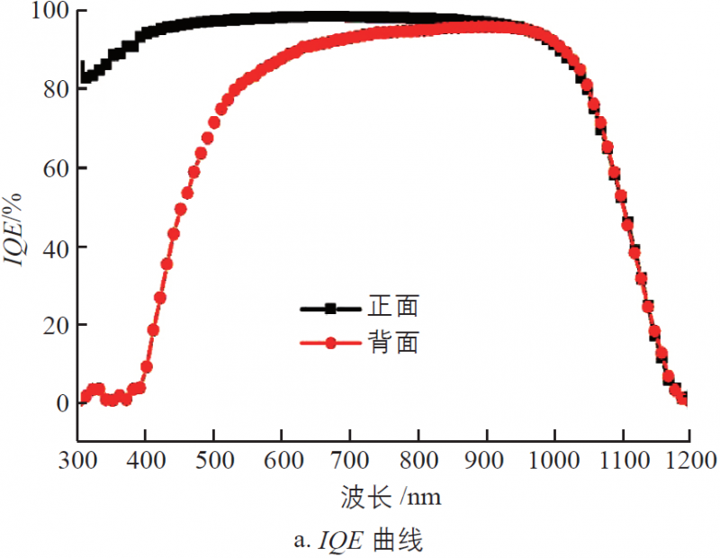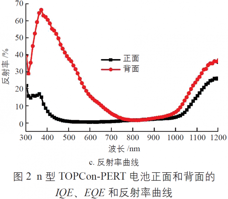 为进一步研究n 型TOPCon-PERT 电池的光谱响应特性,分别测试了该电池正面和背面的IQE、EQE 及反射率,测试结果如图2 所示。