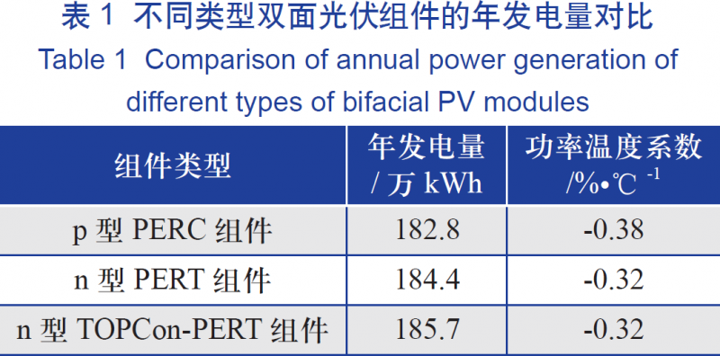 太阳电池的输出功率由工作电流与工作电压共同决定,工作电压由半导体材料的禁带宽度与费米能级决定,随着温度升高,费米能级就会越靠近价带,工作电压会在一个较大范围内变小;而工作电流受温度影响的变化很小。当工作电流I 基本不变,工作电压U 大幅度变化时,由功率P 的计算公式P=UI 可知,功率的变化趋势与工作电压基本一致。因此,功率温度系数越大、运行温度越高,在相同条件下运行时,光伏组件发电量受温度的影响越大。由表1 可知,2 种n 型双面光伏组件的功率温度系数与p 型双面光伏组件相差的0.06%/℃,而组件在运行时的温度可达70℃。由于n 型TOPCon-PERT 组件的功率温度系数较低,因此其在夏季环境温度较高时的温度损失相对较小,而在冬季时与其他2 种双面光伏组件的温度损失基本相当。