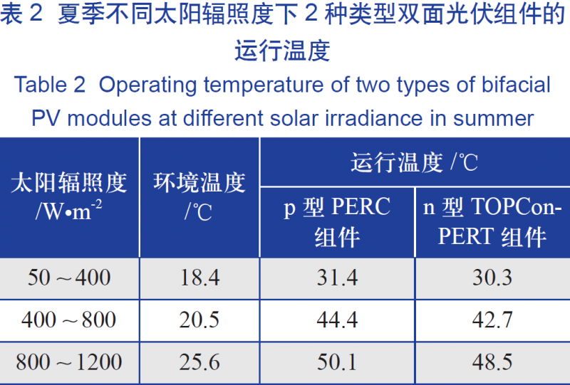 进一步收集夏季不同太阳辐照度( 太阳辐照度>50 W/m2) 下p 型PERC 组件和n 型TOPCon-PERT 组件的运行温度,具体如表2 所示。从表中可以发现,n 型TOPCon-PERT 组件的运行温度整体低于p 型PERC 组件的,所以其温度损失相对较少。