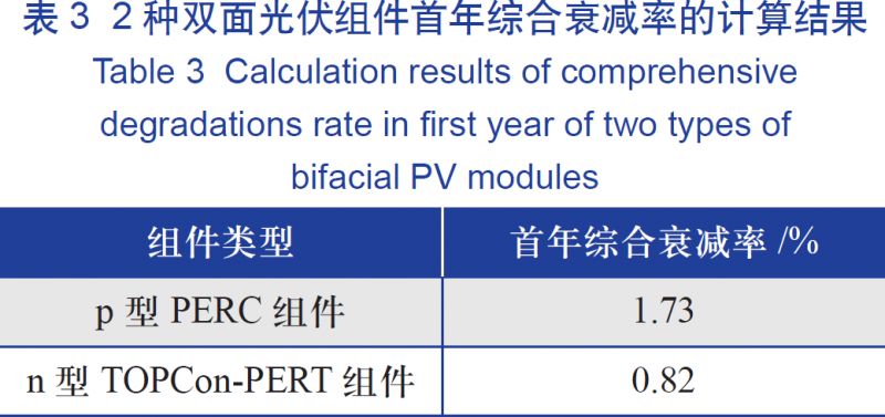 从表3 中可以看出,2 种双面光伏组件的首年综合衰减率相差0.91%,这表明n 型TOPCon-PERT 组件的抗衰减特性优于p 型PERC 组件。电池的光致衰减主要发生在首年,同时伴随着较小的材料老化衰减,之后电池的光致衰减基本完成,衰减方式主要为材料老化衰减。由于这2 种双面光伏组件所采用的主要原、辅材料相同,因此可认为二者的材料老化衰减率基本接近,从而也说明了n 型TOPCon-PERT 电池的整体抗衰减特性优于p 型PERC 电池。