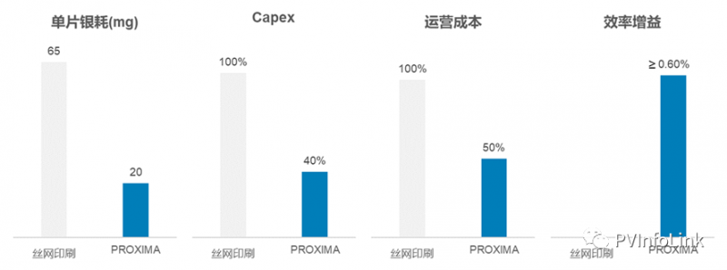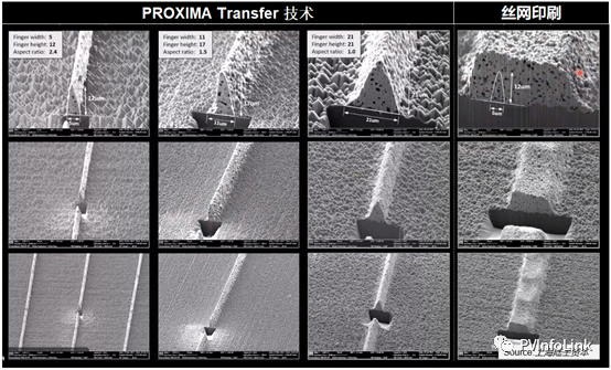 最重要的是,该技术印刷出来的细栅线的最小宽度能够做到5µm,产线设备能够做到10µm左右,同时能保持1:1.5的超高高宽比,从而很好的降低遮光面积提高电池的转换效率(不低于0.6%)。极细的栅线也决定了PROXIMA 可大幅降低银耗。
