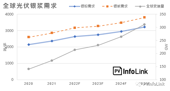 从20世纪60年代初到2021年,白银跟随黄金经历了多轮牛熊市转变,白银价格虽然在不同的历史时间呈现出不同的发展特点和走势,但是整体来看,白银价格跟随黄金价格在近半个世纪以来呈现上涨趋势。尽管PERC银浆单耗随着大尺寸的导入和工艺的进步下降显著,但是后续PERC银浆单耗下降空间已经非常有限,另外,随着越来越多的新产能选择TOPCon和HJT电池技术,因为TOPCon和HJT双面使用银浆的特性,导致整体光伏电池银浆单耗下降缓慢。可以预见的是随着全球光伏安装量的不断攀升,光伏对于白银的需求将越来越高,根据PV Infolink的统计分析,光伏对于白银的需求将在2024年达到3000吨左右并呈现逐年增长的趋势。随着光伏对于白银需求的持续旺盛,有可能打破现有的白银供需格局,或引起新一轮的涨价或白银供给不足。