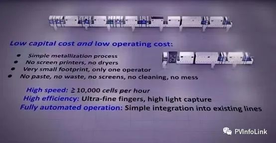 此外该技术设备投资成本低,运营成本相较于丝网印刷也有大幅下降;一站式的设计也决定了该金属化方案占地面积小且只需一名操作工;因为无须银浆和网板,该方案加工过程中可有效避免污染和繁琐的清理工作。