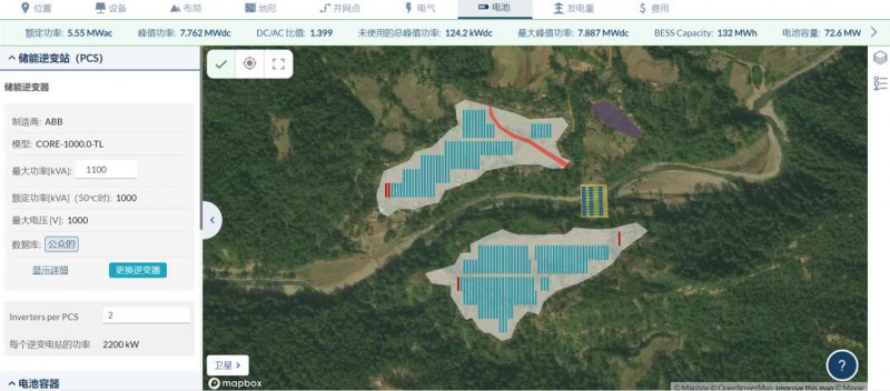 pvDesign 在可用区域内自动定位电池容器和储能逆变站的位置,并将考虑到电池的工作时间,计算电缆的长度和土方工程,以及选定并网点互连设施的电气设配容量。