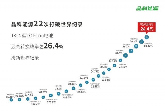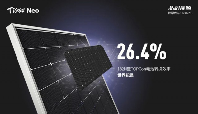 日前,晶科能源宣布,其研究院自主研发的182N型高效单晶硅电池技术取得重大突破,经权威第三方测试认证机构中国计量科学院检测实验室认证,全面积电池转化效率达到26.4%,又一次创造了182及以上尺寸大面积N型单晶钝化接触(TOPCon)电池转化效率的新高。