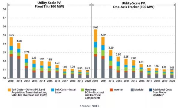 Erthos计算了跟踪性能增益由太阳能组件的低价所抵消的阈值。只要组件成本在每瓦38美分的成本之下,可以买更多的太阳能组件来弥补因没有跟踪器而遭受的能量损失。