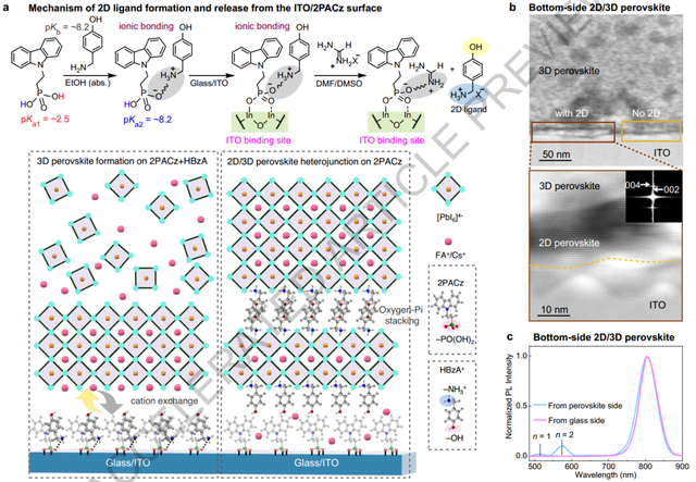 作者开发了具有空穴收集接触(p型)的倒置 (p-i-n) PSC,为了解决钙钛矿薄膜底部形成2D/3D异质结的难题,将HBzA配体混合到 2PACz SAM 溶液中,利用HBzA和2PAC反应形成离子键以及HBzA中的-OH基团可以与-PO(OH)2和ITO 形成氢键,进一步加强附着力,这种结合有利于它们在钙钛矿加工过程中粘附到基底上,并有助于在3D钙钛矿层下方形成2D钙钛矿层。在成功地将HBzA配体附着在ITO/2PACz表面上后,通过旋涂沉积了3D钙钛矿墨水,通过多种表征表明底部界面处的2D钙钛矿形成调节了钙钛矿的结晶。