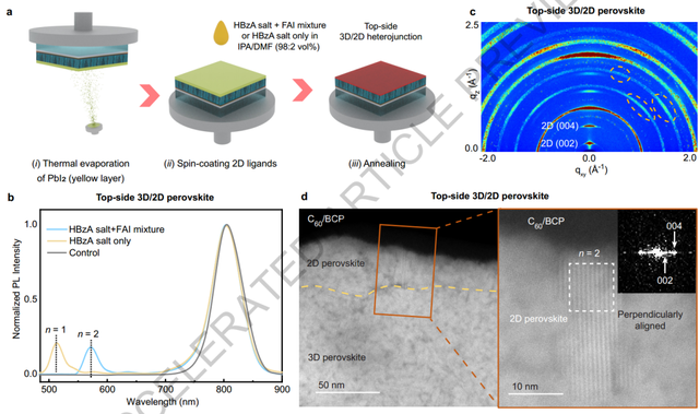 对于顶部界面的3D/2D异质结,作者开发了一种简单的两步混合方法来形成纯相2D钙钛矿层,结果证实了控制2D钙钛矿的相纯度和维度的方法的成功。二维钙钛矿(n>1)钝化层的更高维度至关重要,因为体积较小的有机阳离子界面具有更高的电导率。作者通过GIWAXS测量确定了2D钙钛矿层的晶体取向和维度,通过HR-STEM 可视化了顶部接触处的2D钙钛矿形成和方向,表明混合方法形成钙钛矿异质结构的稳健性。