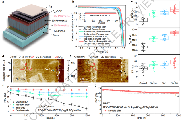 钙钛矿界面工程对于提高钙钛矿太阳能电池(PSC)的性能和稳定性至关重要,2D/3D钙钛矿异质结在这方面表现出了特别的前景。然而,由于电荷复合、离子迁移和电场不均匀性,3D钙钛矿光吸收器顶部和底部界面的缺陷会降低钙钛矿太阳能电池(PSC)的性能和运行稳定性。
