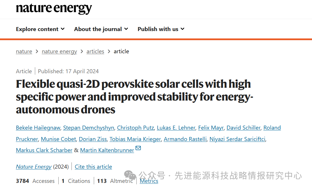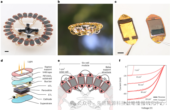该研究报道了一种超轻薄的准二维钙钛矿太阳能电池,该器件可直接在超薄、高阻隔的非晶铝涂层聚合物衬底上制造,从而用于能源自主无人机。该PSC以α-甲基苄基碘化铵(MBAI)作为关键的大型有机阳离子添加剂,具有出色的开路电压,功率转换效率高达20.1%,功率密度为44 W·g−1(平均18.1%和41 W·g−1),并且具有优异的环境稳定性和机械弹性。进一步使用24个单独的超轻型PSC组装成超轻型能量收集模块,并用于无人机,使得四轴飞行器在飞行-充电-飞行循环中实现能量自主操作,无需有线充电即可延长飞行时间。该研究制备的太阳能电池将直接有利于执行监视、侦察、搜索和救援、大规模测绘、空间太阳能发电或太阳系探索等任务的自主系统的运行。相关研究成果发表于《Nature Energy》。