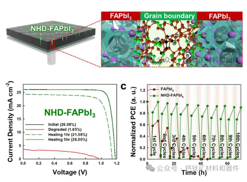 树枝状聚合物通过捕获挥发性甲脒物质和稳定 PbI₆ 八面体来促进修复,形成中间相,在暴露于湿度时支持立方型和降解多型之间的可逆转变。因此,含有这些树枝状聚合物的PSCs表现出超过26%的功率转换效率(PCE),即使在湿干交替条件十个循环后,也可以恢复90%以上的初始PCE。结构和光谱分析,包括 X 射线衍射和光电子能谱,证实了晶体质量的增强和电荷捕获位点的抑制。