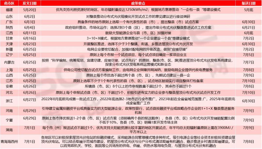 自6月20日国家能源局综合司正式下发《关于报送整县(市、区)屋顶分布式光伏开发试点方案的通知》以来,已有多地正式下发了《关于报送整县(市、区)屋顶分布式光伏开发试点方案的通知》,近日再添宁夏、湖南、青海海西州等三地推出相关政策,分布式光伏整县推进已经达20省市。