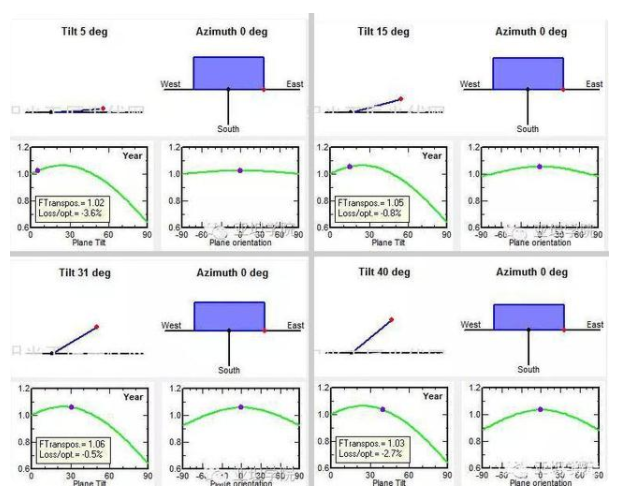 家庭光伏发电倾角对发电效率是有影响,但是,一般情况下,这个影响可以忽略不计,安装公司会综合考虑,选择一个合适的角度安装。就拿上面上海光伏发电的例子,上海北纬31度,用仿真软件分别计算5度、15度、25度、30度、40度的效率损失,分别为3.6%、0.8%、0、0.5%、2.7%,从数据可以看出,上海光伏板安装倾角15度到35度都是可以的。如果为了争取0.5%的效率而浪费50%场地面积,收益反而下降。