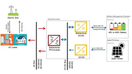 混合逆变器可有效提高转换级的效率,但这种效率提高对于执行多次功率转换的配备 ESS 的微电网更为重要。电源转换器系统管理 DC/DC 转换以对电池进行充电和放电。它还管理 DC/AC 和 AC/DC 转换,将存储在电池中的直流电转换为交流电,以便流入和流出电网。