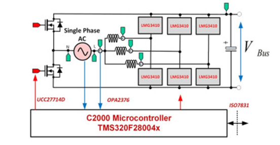 图3.具有数字控制的GaN CCM图腾柱参考设计,使用C2000实时微控制器和具有内置栅极驱动器和保护功能的快速开关GaN器件。
