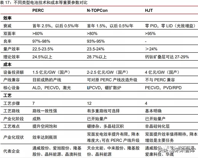 1)从效率角度看:TOPCon电池的极限理论效率达到28.7%,高于HJT的27.5%和PERC的24.5%。而从目前量产效率看,PERC已经达到23%附近,TOPCon和HJT已经超过24%,但距极限效率仍有一定差距,效率提升的空间更大;