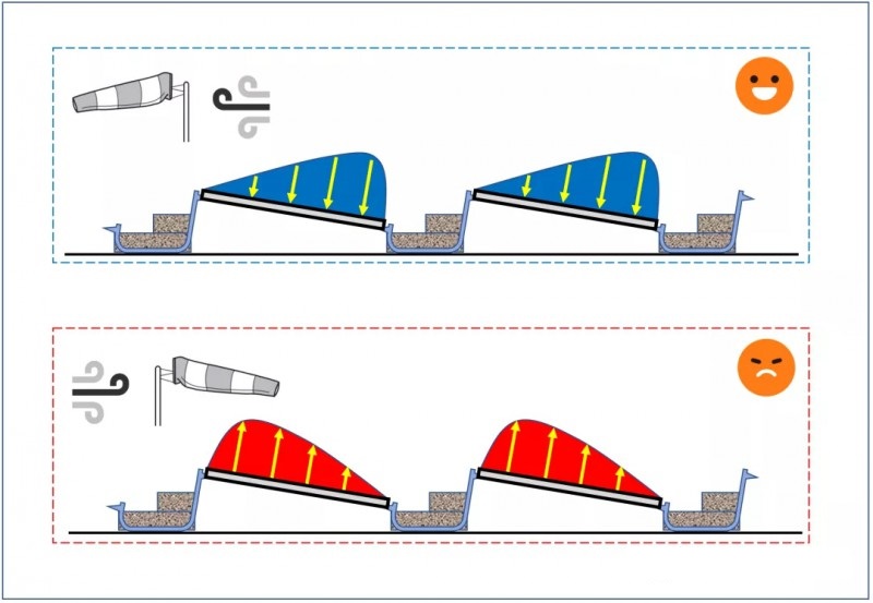 可以说上面的这些规范和标准,都是基于大量的风洞测试结果,这些数据对平屋顶光伏支架的设计,提供了“定性的设计方向”和“定量的计算依据”。而在没有出现这些规范之前,平屋顶的光伏支架设计往往都是差强人意,出现了很多的疏漏。