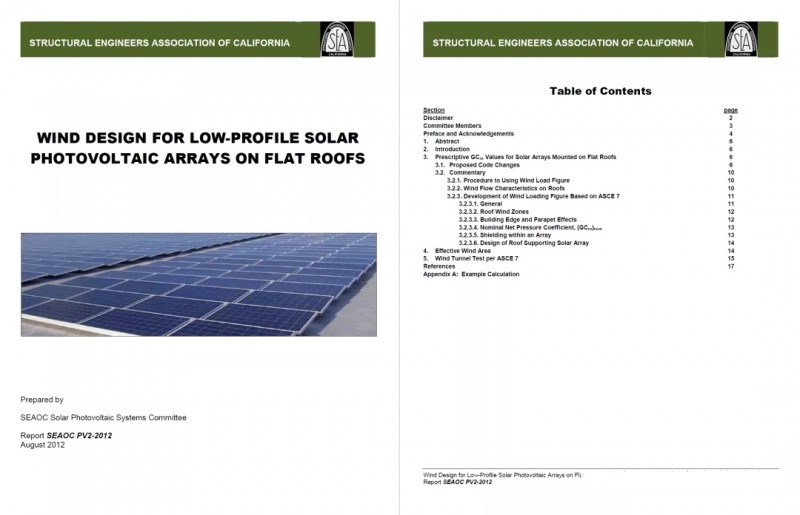 SEAOC PV2-2012创造性的提供了计算公式和数值依据,将原先风洞测试中普适性的“现象”,处理成了一系列“定量”的数据。利用这些具体的数据,工程师们就可以来设计屋顶光伏支架的风荷载大小了。
